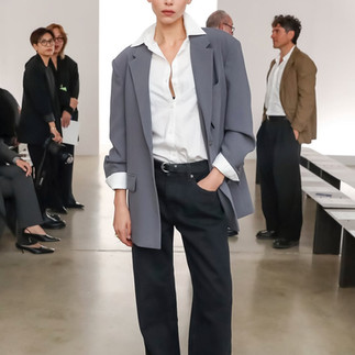 Catherine Holstein doesn’t just design clothes — she designs an attitude. Opening with jeans, a blazer sliced at the sides, and slingbacks, she immediately flexed her formula: stealth luxury, razor-sharp tailoring, and a bit of danger.